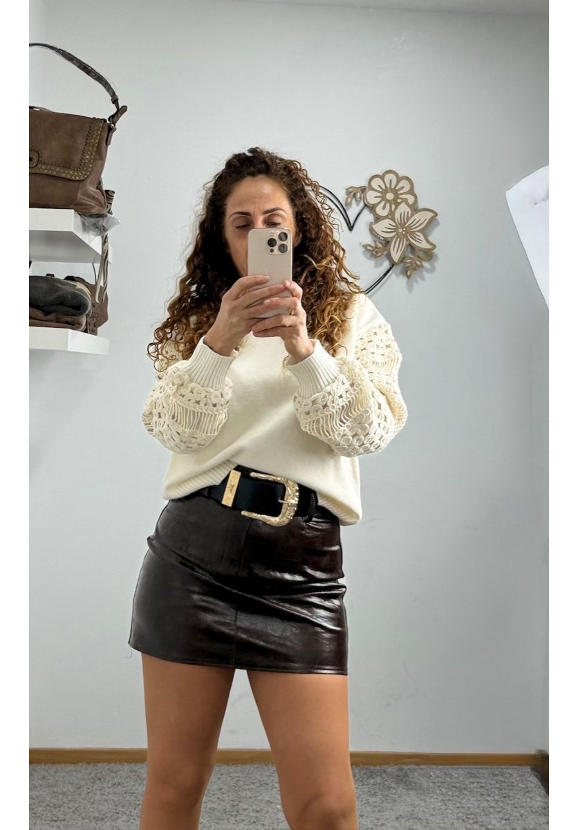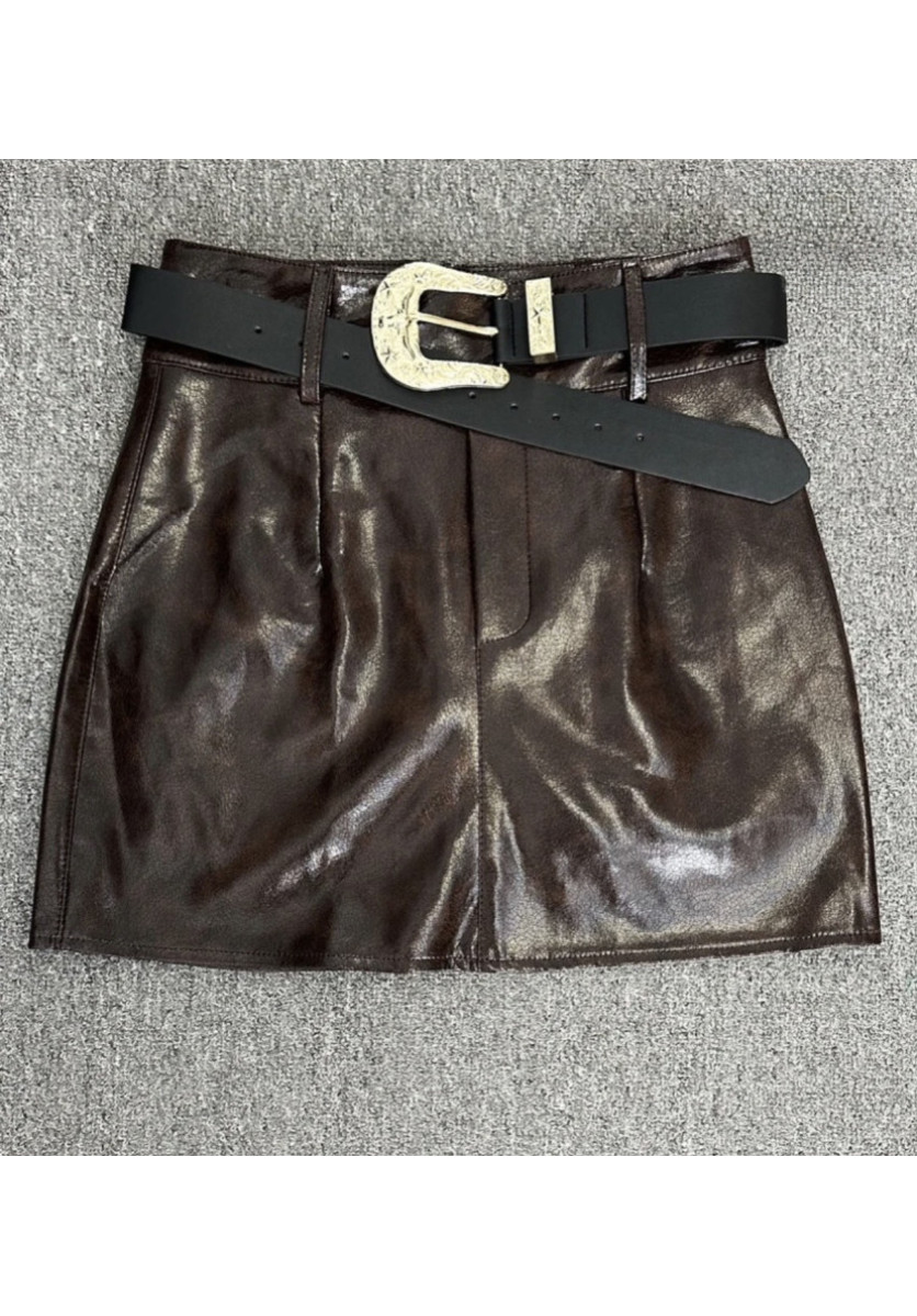 FALDA CORTA DE CUERO SINTETICO EN TONO MARRÓN CHOCOLATE, DE TIRO ALTO Y CORTE RECTO. TIENE UN DISEÑO MINIMALISTA PER0 ELEGANTE,DESTACA UN CINTURON ANCHO NEGRO CON UNA HEBILLA DORADA GRANDE, QUE APORTA UN CONTRASTE LLAMATIVO Y UN AIRE SOFISTICADO.