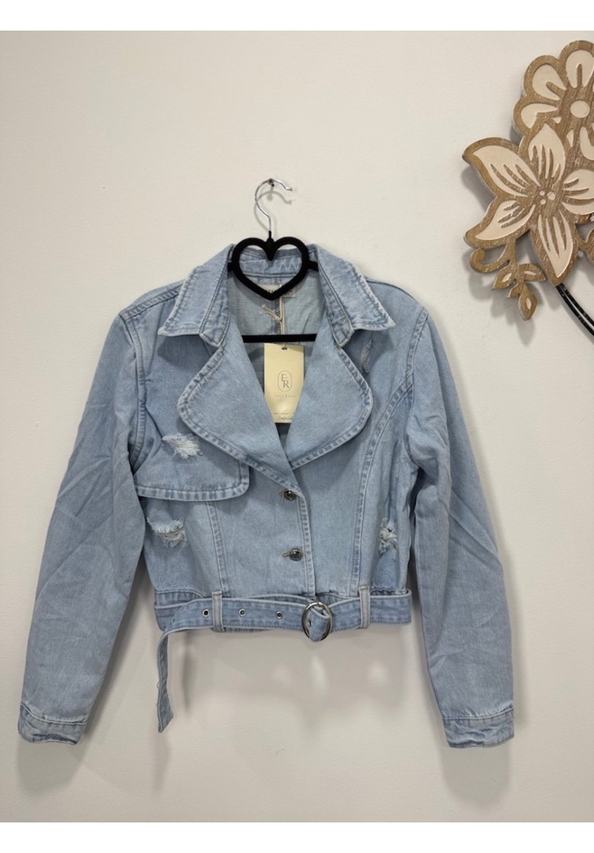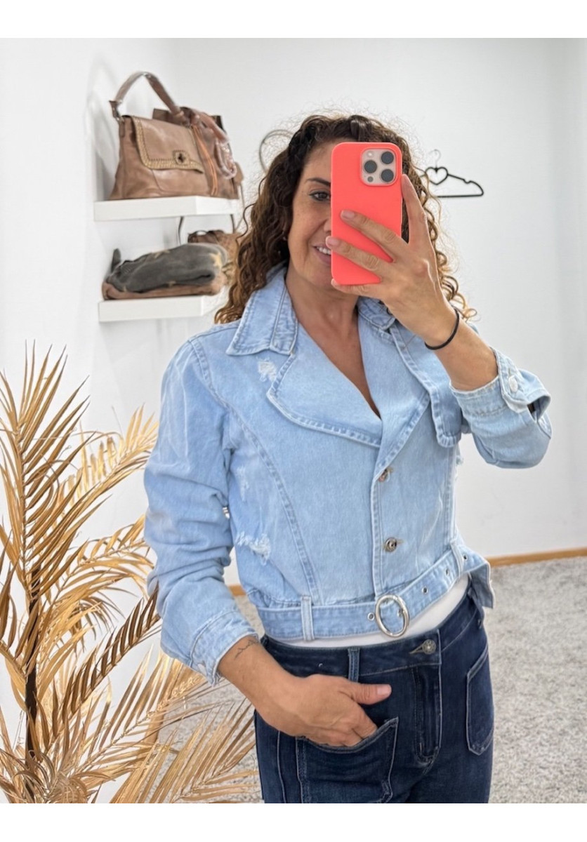 CHAQUETA CORTA TIPO TRENCH EN DENIM AZUL CLARO, TIENE UN AIRE CASUAL PERO CON ESTRUCTURA.