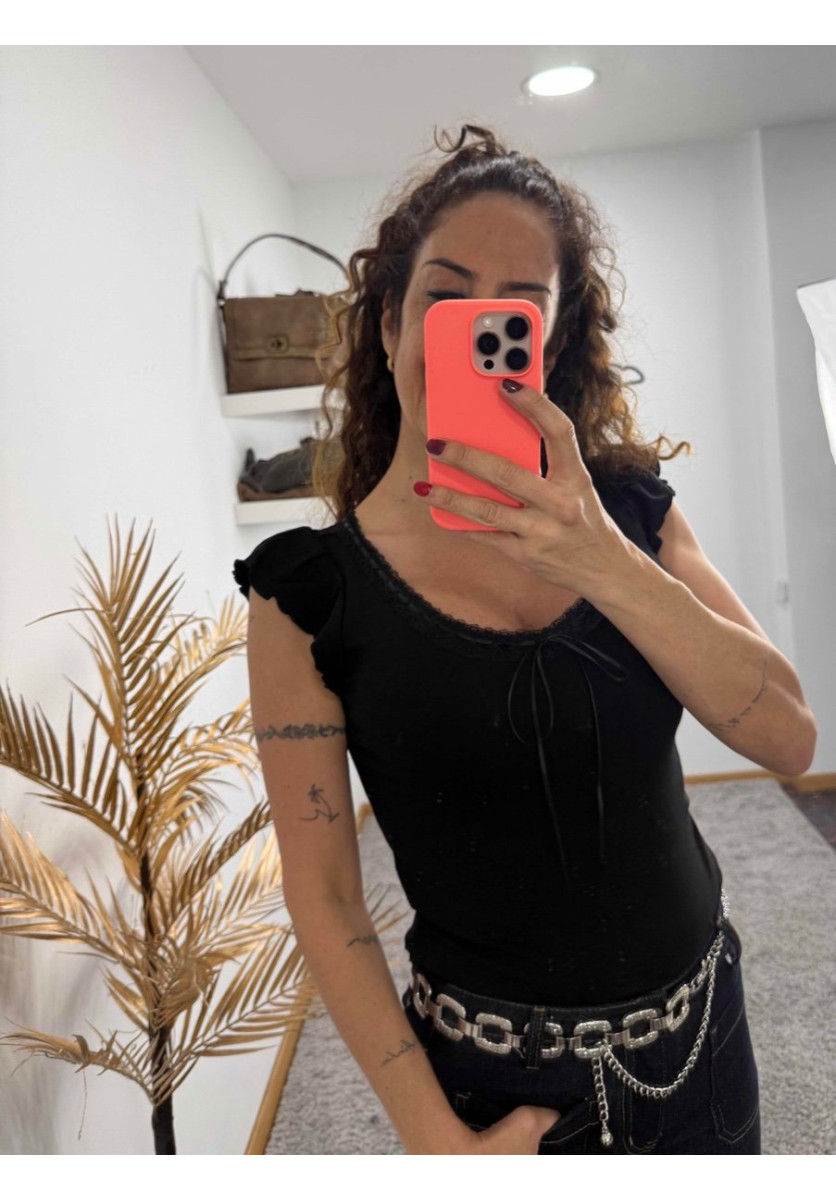 TOP ESTILO ROMÁMTICO Y DELICADO, CON ESCOTE DE PICO Y DETALLES DE LAZO AJUSTABLE EN LA PARTE FRONTAL. TIENE MANGA CORTA ABULLONADA , QUE APORTA UN TOQUE FEMENINO Y FAVORECEDOR, Y UN ACABADO CON BORDE ONDULADO.
