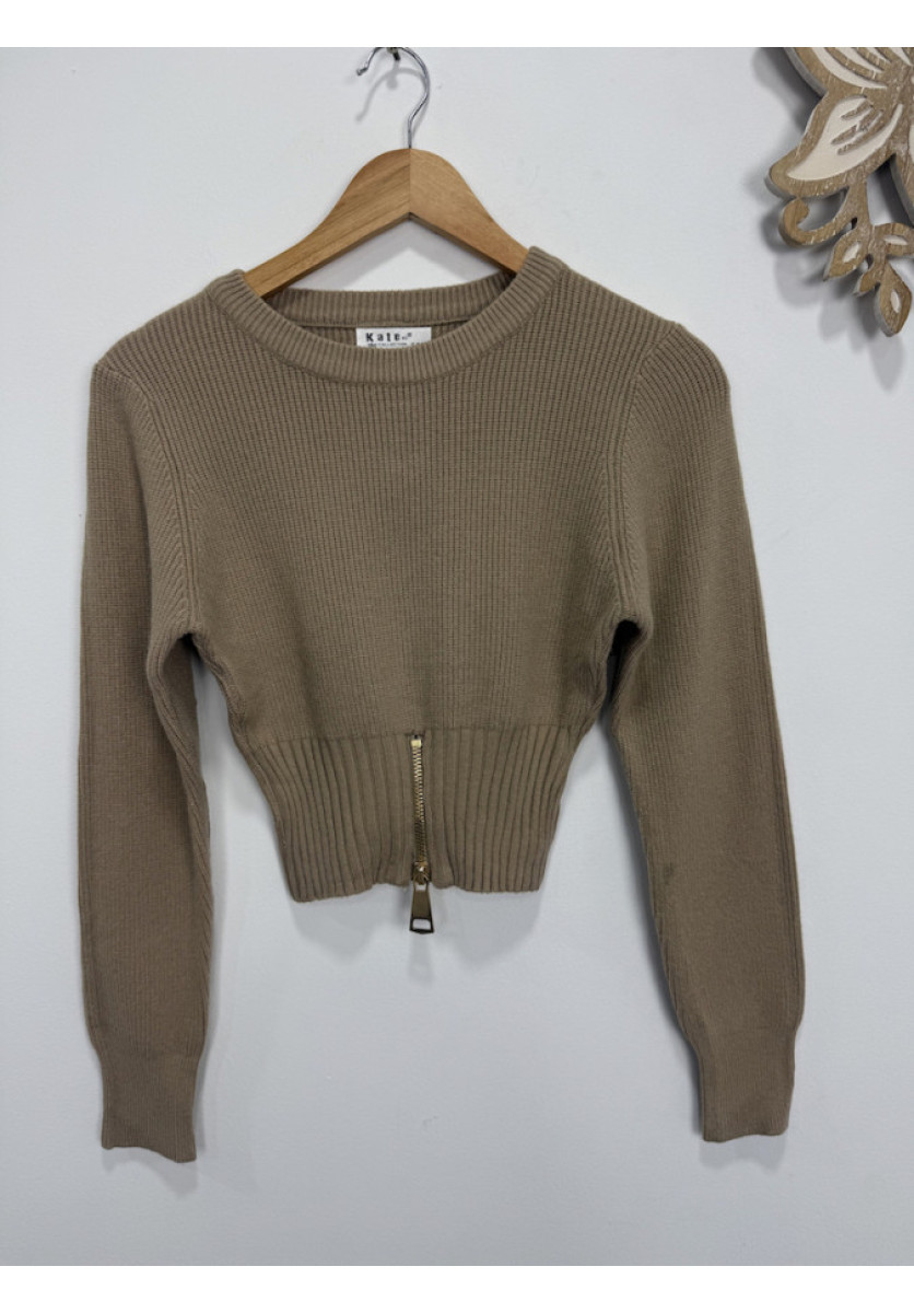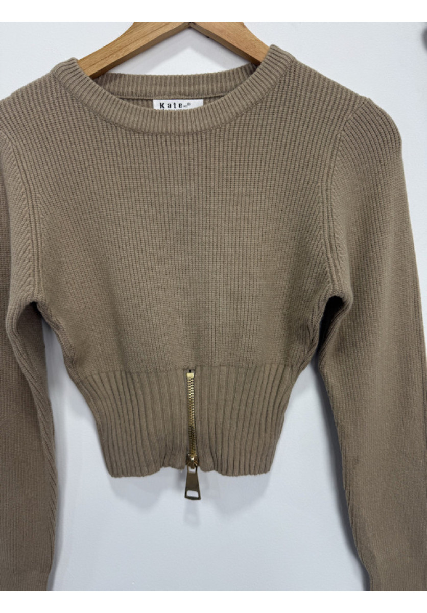 SUÉTER CORTO DE TEJIDO ACANALADO, EL DETALLE PROTAGONISTA ES EL CIERRE METÁLICO CON CREMALLERA  COLOR DORADO, UBICADO EN EL CENTRO.