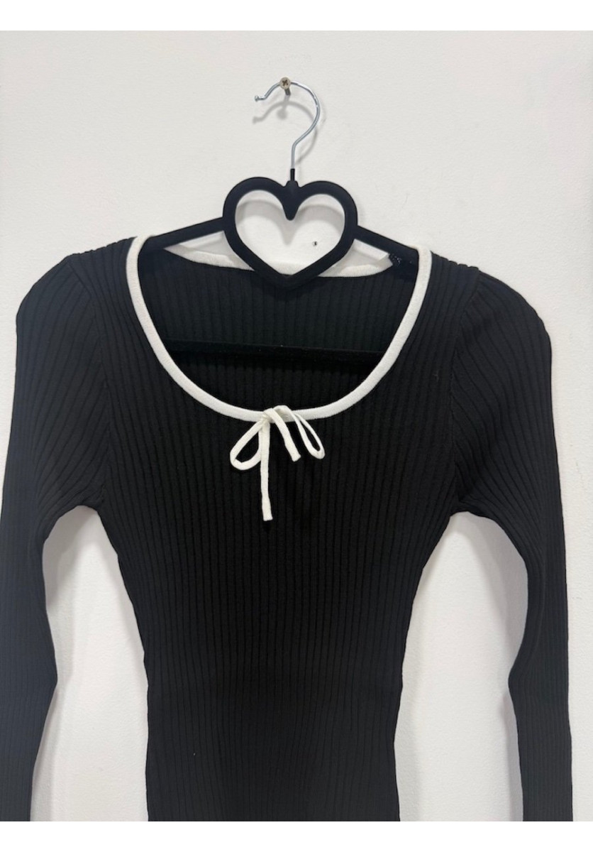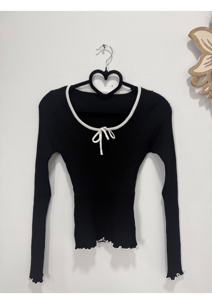 TOP DE PUNTO CANALÉ CON UN DISEÑO SUPER FEMENINO Y ELEGANTE. LLEVA ESCOTE REDONDO AMPLIO CON RIBETEEN CONTRASTE BLANCO Y UN LAZO DECORATIVO EN EL CENTRO QUE LE DA UN TOQUE ROMÁNTICO.