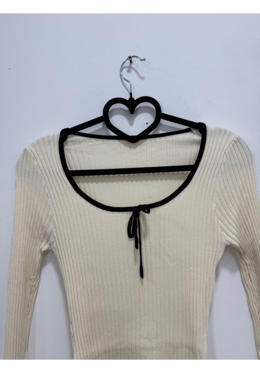TOP DE PUNTO CANALÉ CON UN DISEÑO SUPER FEMENINO Y ELEGANTE. LLEVA ESCOTE REDONDO AMPLIO CON RIBETEEN CONTRASTE BLANCO Y UN LAZO DECORATIVO EN EL CENTRO QUE LE DA UN TOQUE ROMÁNTICO.