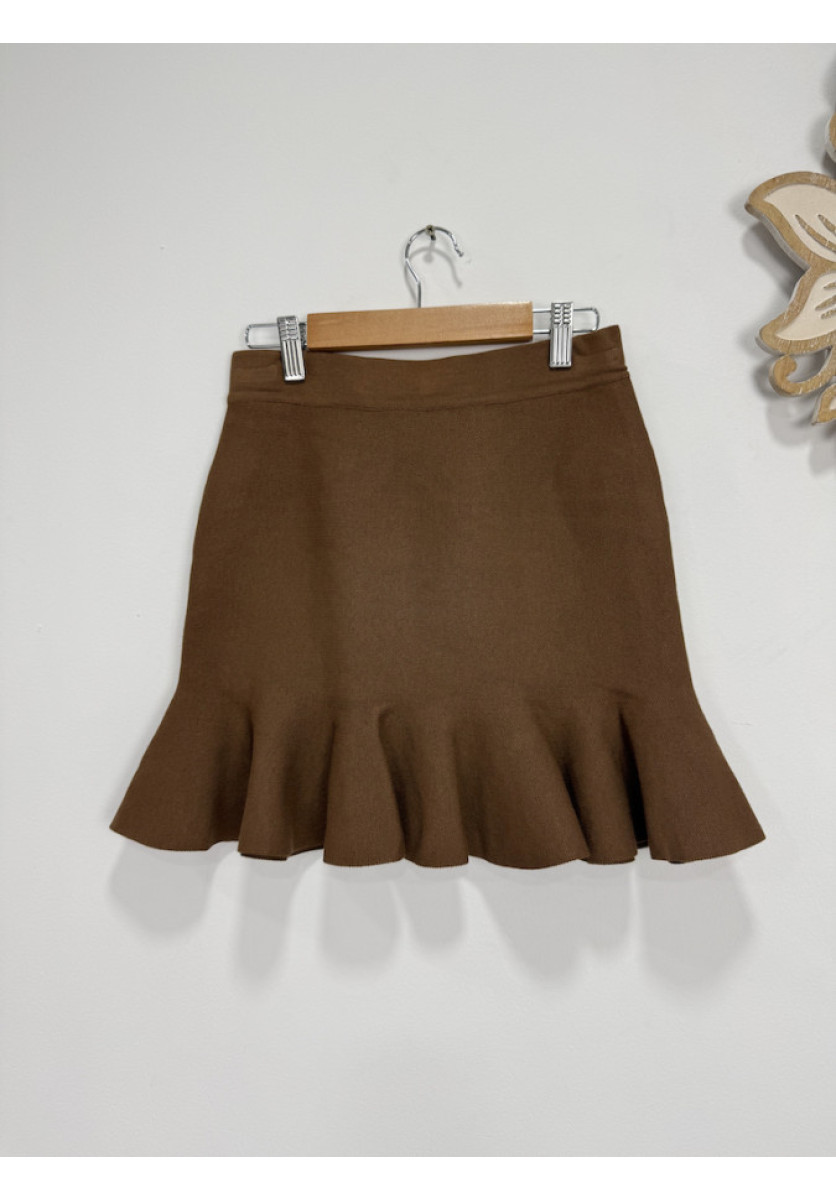 FALDA CORTA DE COLOR MARRÓN CHOCOLATE, TELA FUERTE DE PUNTO. EL BAJO ESTÁ TERMINADO CON UN VOLANTE AMPLIO QUE AÑADE MOVIMIENTO Y UN AIRE FEMENINO.