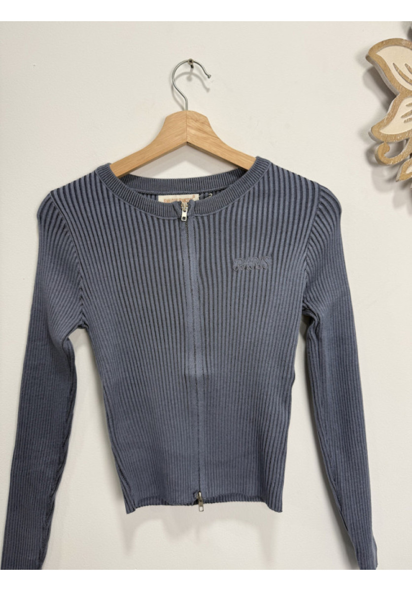 CHAQUETA DE PUNTO ACANALADO AZUL , DE CORTE ENTALLADO.PRESENTA CIERRE FRONTAL CON CREMALLERA, CUELLO REDONDO, EL TEJIDO ES ELÁSTICO Y SE AJUSTA AL CUERPO, LO QUE HACE CÓMODA Y FAVORECEDORA.INCLUYE UN PEQUEÑO BORDADO DECORATIVO EN EL PECHO.