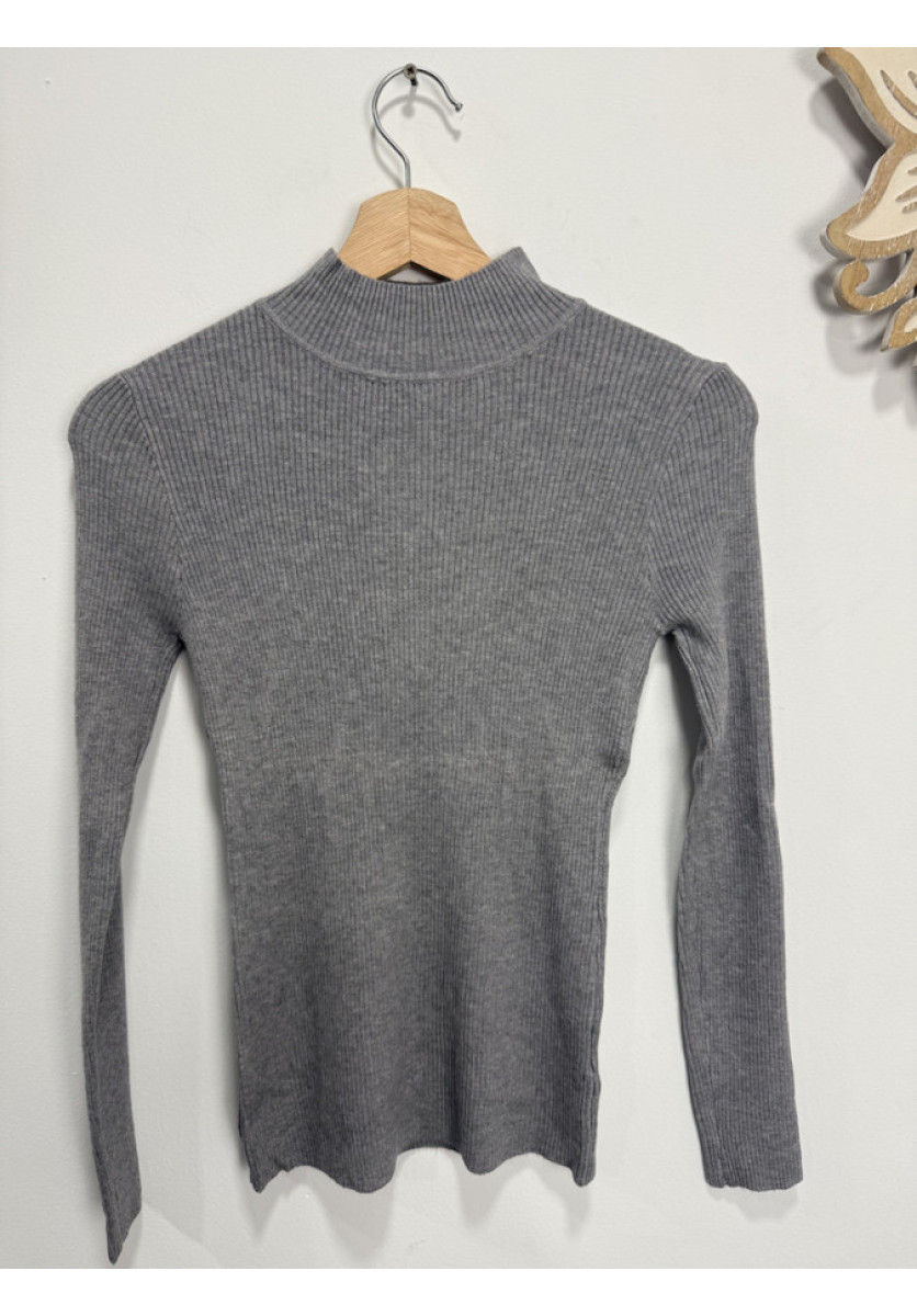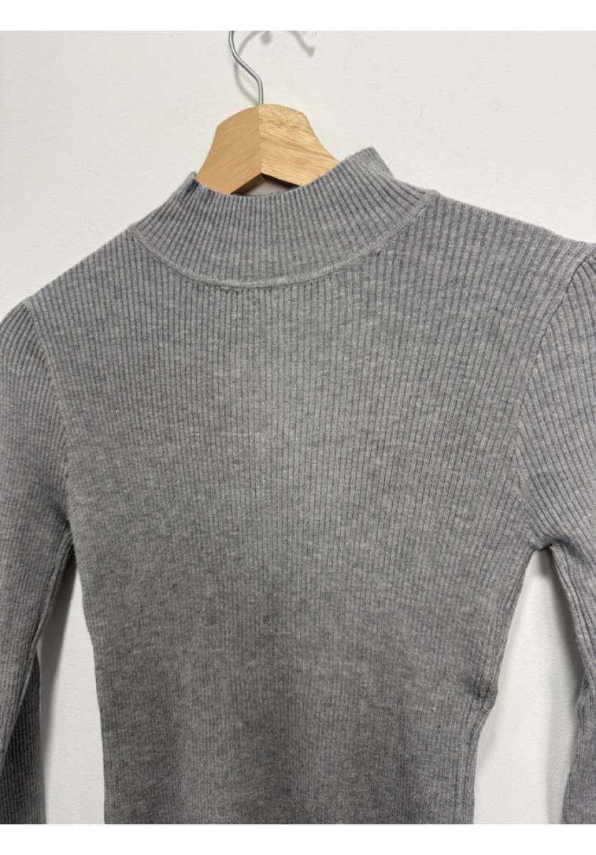 JERSEY DE PUNTO ACANALADO EN COLOR GRIS DE MANGA LARGA Y CORTE ENTALLADO, TIENE UN CUELLO ALTO TIPO MOCK QUE LE DA UN AIRE ELEGANTE. EL TEJIDO ES ELÁSTICO Y FINO.