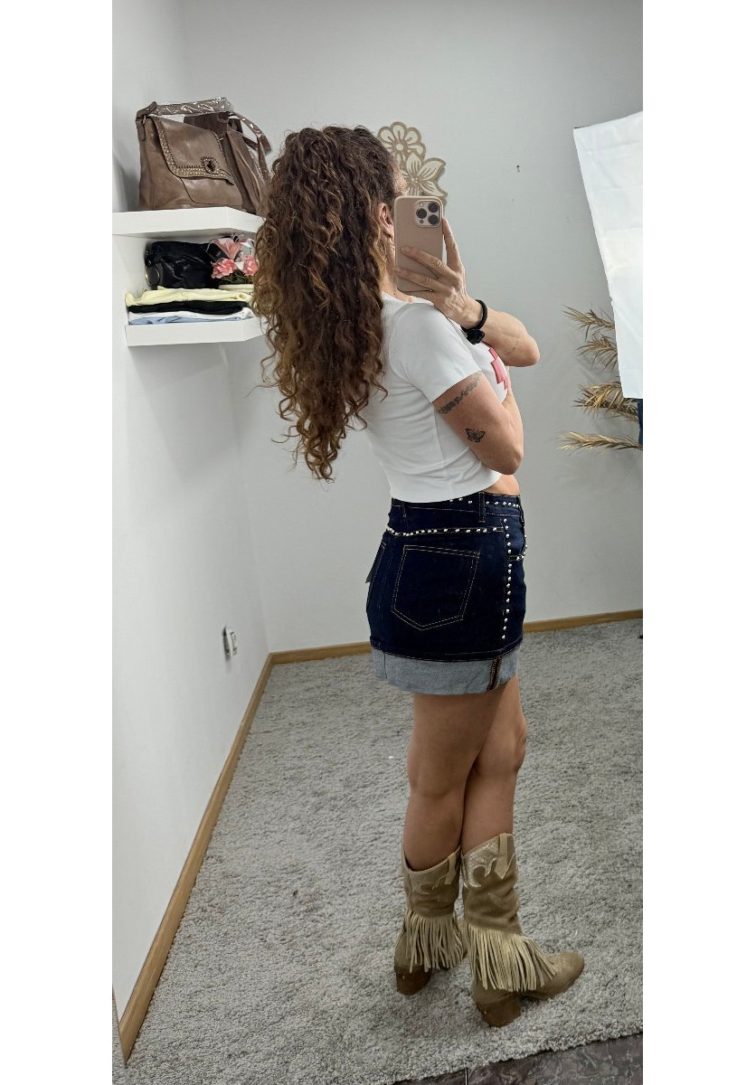 FALDA VAQUERA DE TIRO ALTO CON DETALLES DE TACHUELAS METÁLICAS QUE APORTAN UN TOQUE CAÑERO Y ACTUAL DISEÑO CORTO CON BAJO DOBLADO Y COMBINACIÓN DE TONOS DENIM QUE LE DA UN ESTILO MODERNO Y CON PERSONALIDAD PERFECTA PARA CREAR LOOKS URBANOS Y CON CARÁCTER