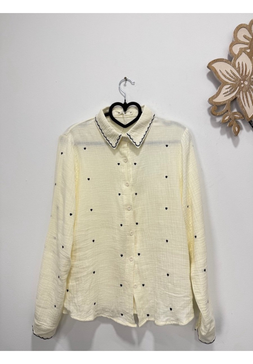 CAMISA EN TONO CRUDO, DISEÑO CON CORAZONES BORDADOS EN COLOR NEGRO QUE LE DA UN TOQUE ROMANTICO Y DELICADO. CUENTA CON UN CUELLO BEBÉ CON DETALLE ONDULADO Y RIBETE EN CONTRASTE OSCURO.