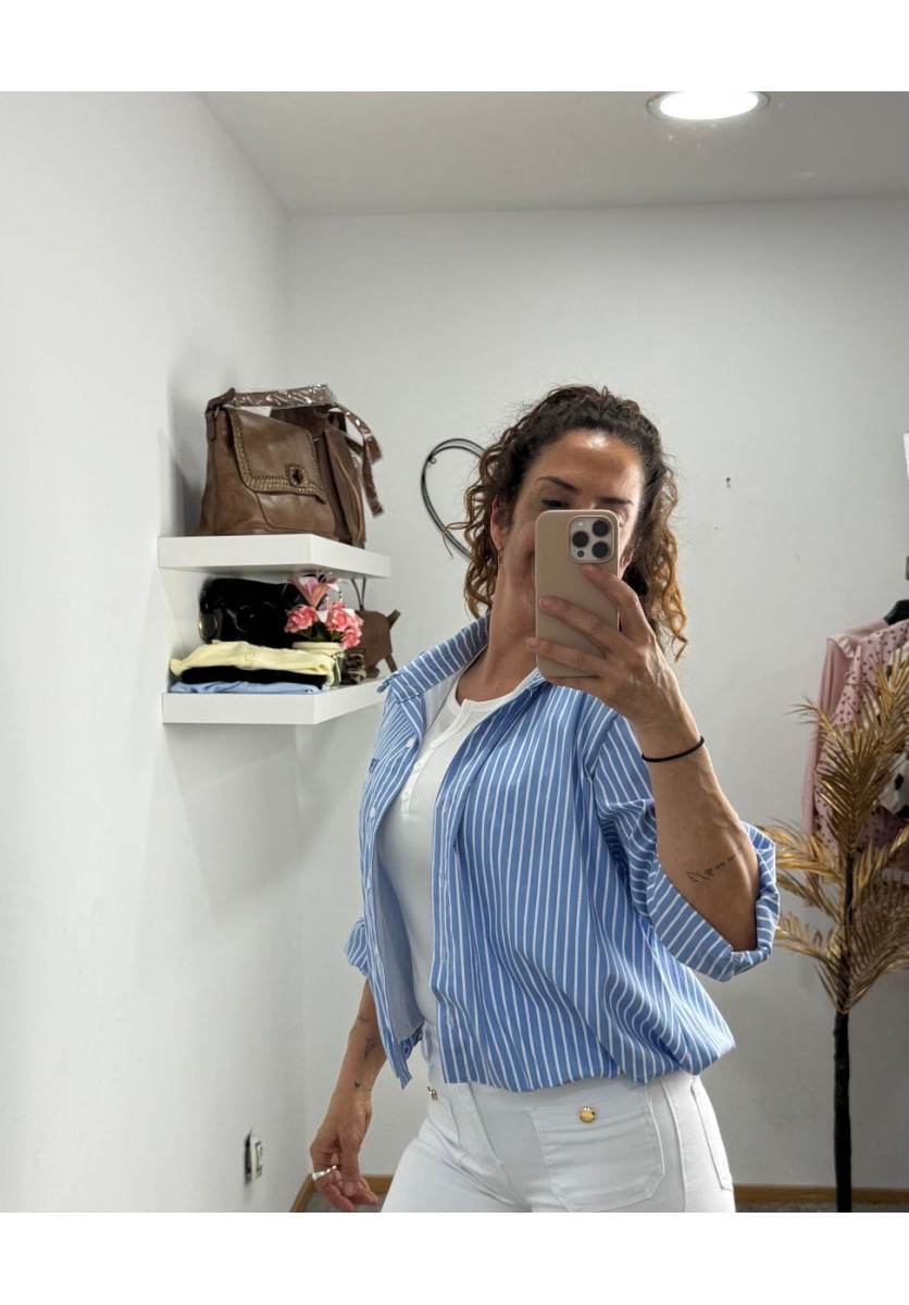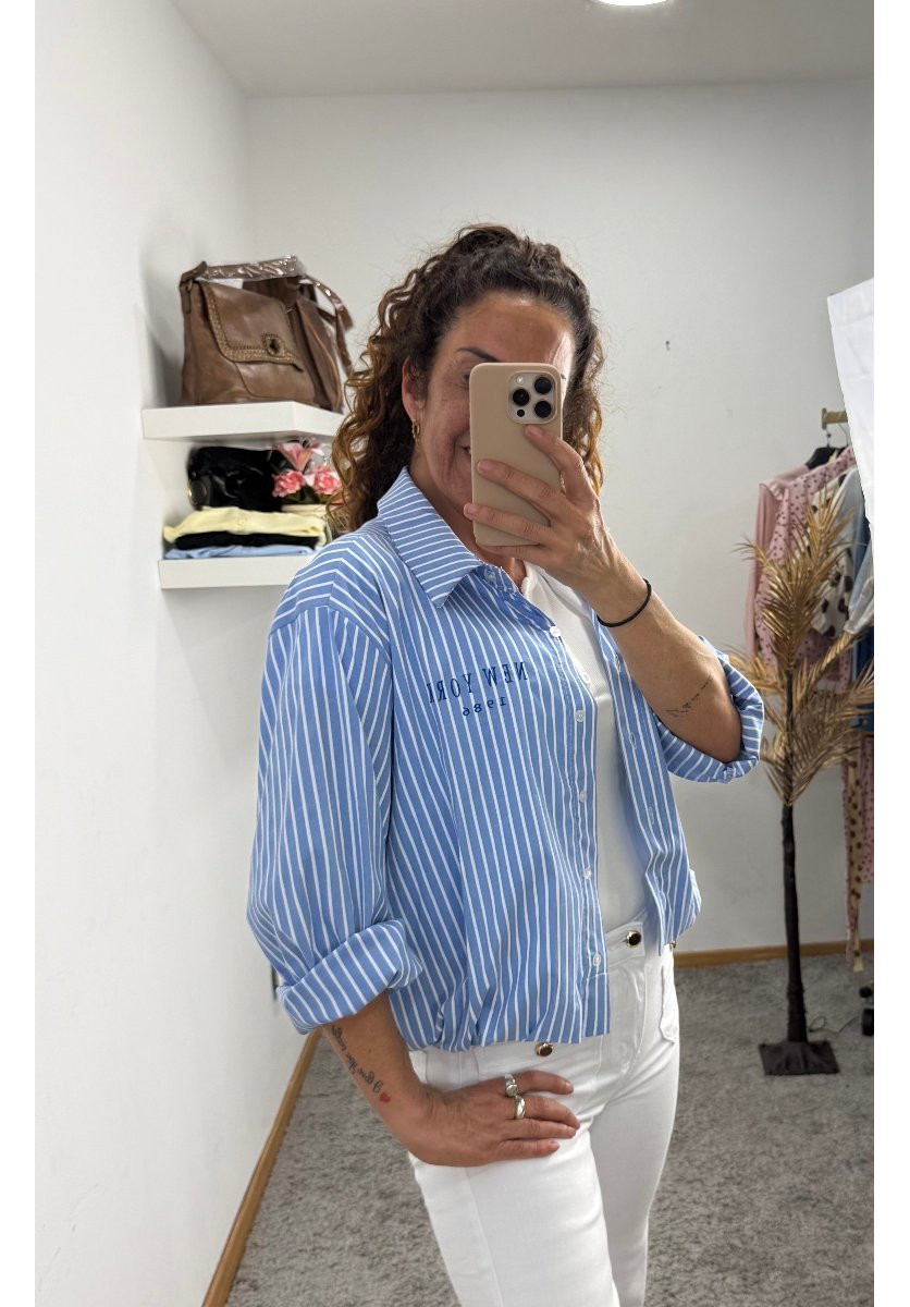 CAMISA AZUL DE RAYAS BLANCAS CON CORTE SUELTO Y ESTILO ACTUAL DETALLE DE TEXTO BORDADO EN EL PECHO QUE LE APORTA UN TOQUE MODERNO Y URBANO TEJIDO LIGERO Y CÓMODO PERFECTO PARA CONSEGUIR UN LOOK FRESCO, VERSÁTIL Y CON PERSONALIDAD