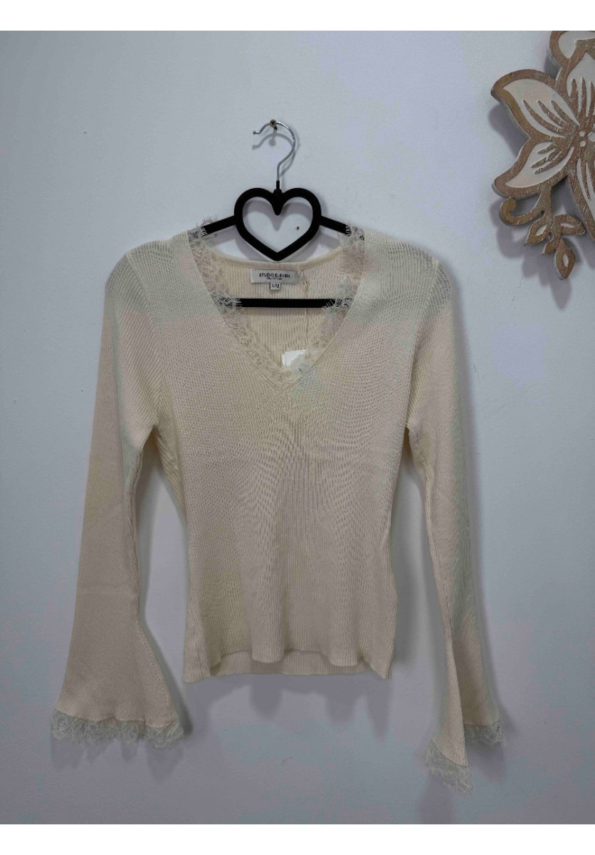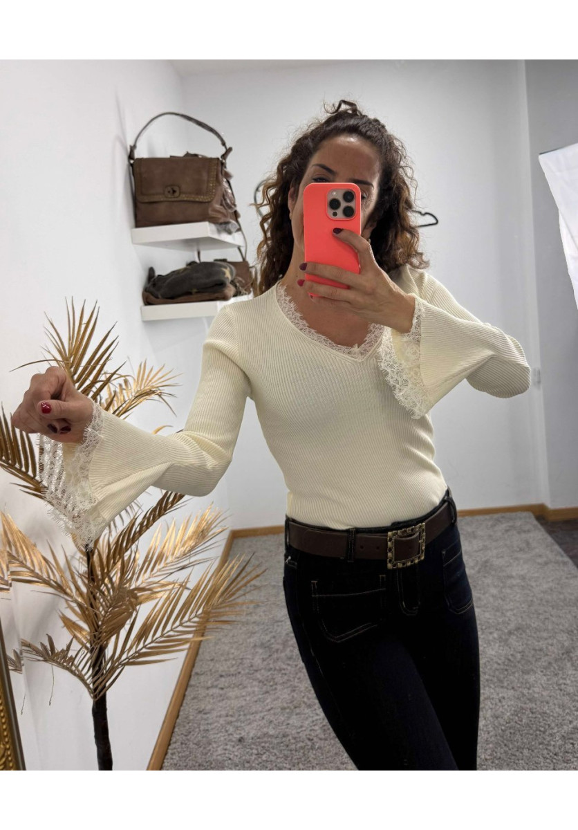 JERSEY FINO DE PUNTO CANALÉ EN TONO BEIGE, IDEAL PARA LOOKS SUAVES Y ELEGANTES. PRESENTA UN ESCOTE EN PICO CON DELICADO DETALLE DE ENCAJE, QUE APORTA UN TOQUE ROMÁNTICO Y FEMENINO. LAS MANGAS LARGAS TERMINAN EN UN ACABADO DE ENCAJE A JUEGO.