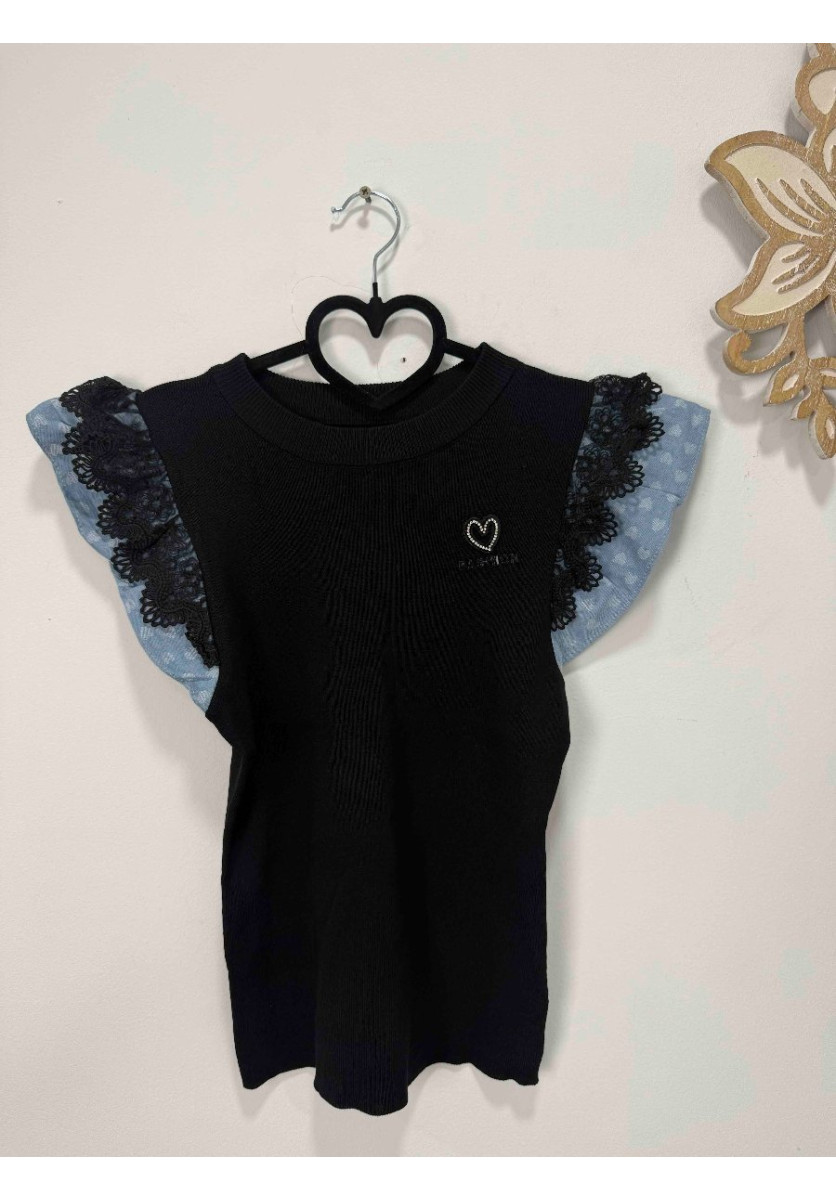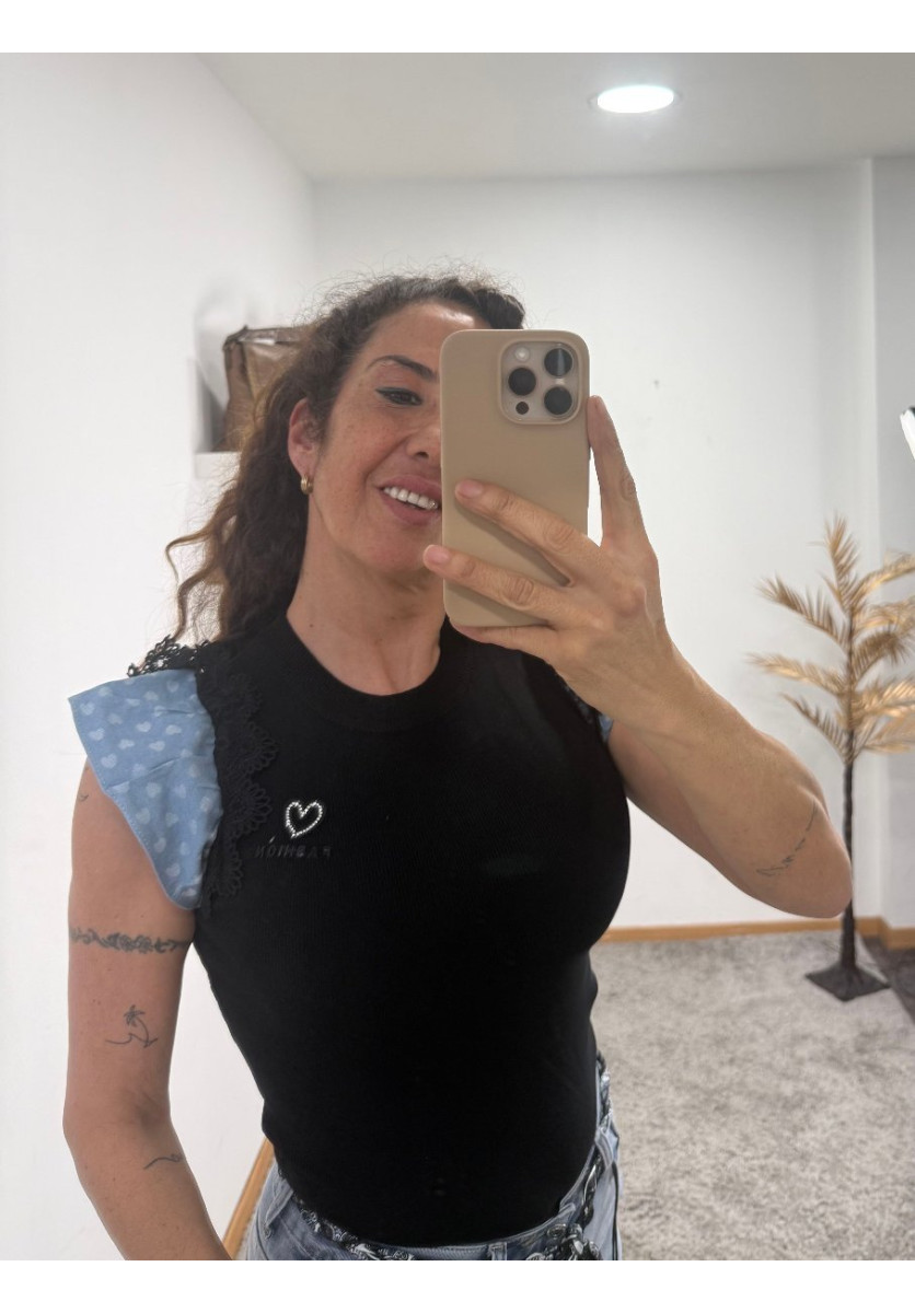 Camiseta de estilo femenino y delicado, confeccionada en tejido negro elástico que se adapta cómodamente al cuerpo. Destaca por sus mangas cortas en tono azul con sutil estampado y acabado en encaje negro, que aportan un toque romántico y sofisticado.En el pecho incorpora un detalle de corazón bordado con pedrería que realza el diseño y le da un aire elegante y especial. Su cuello redondo y corte favorecedor la convierten en una prenda versátil, ideal tanto para looks casuales como para ocasiones más arregladas.