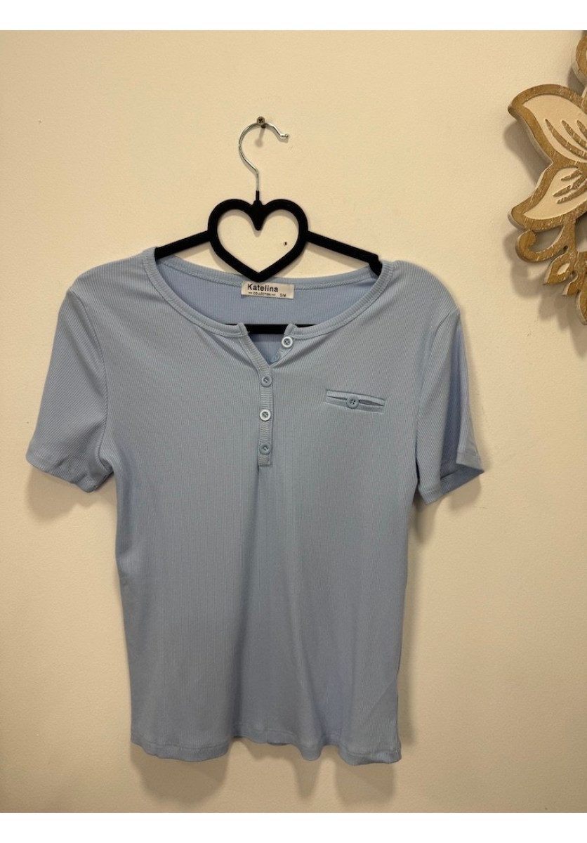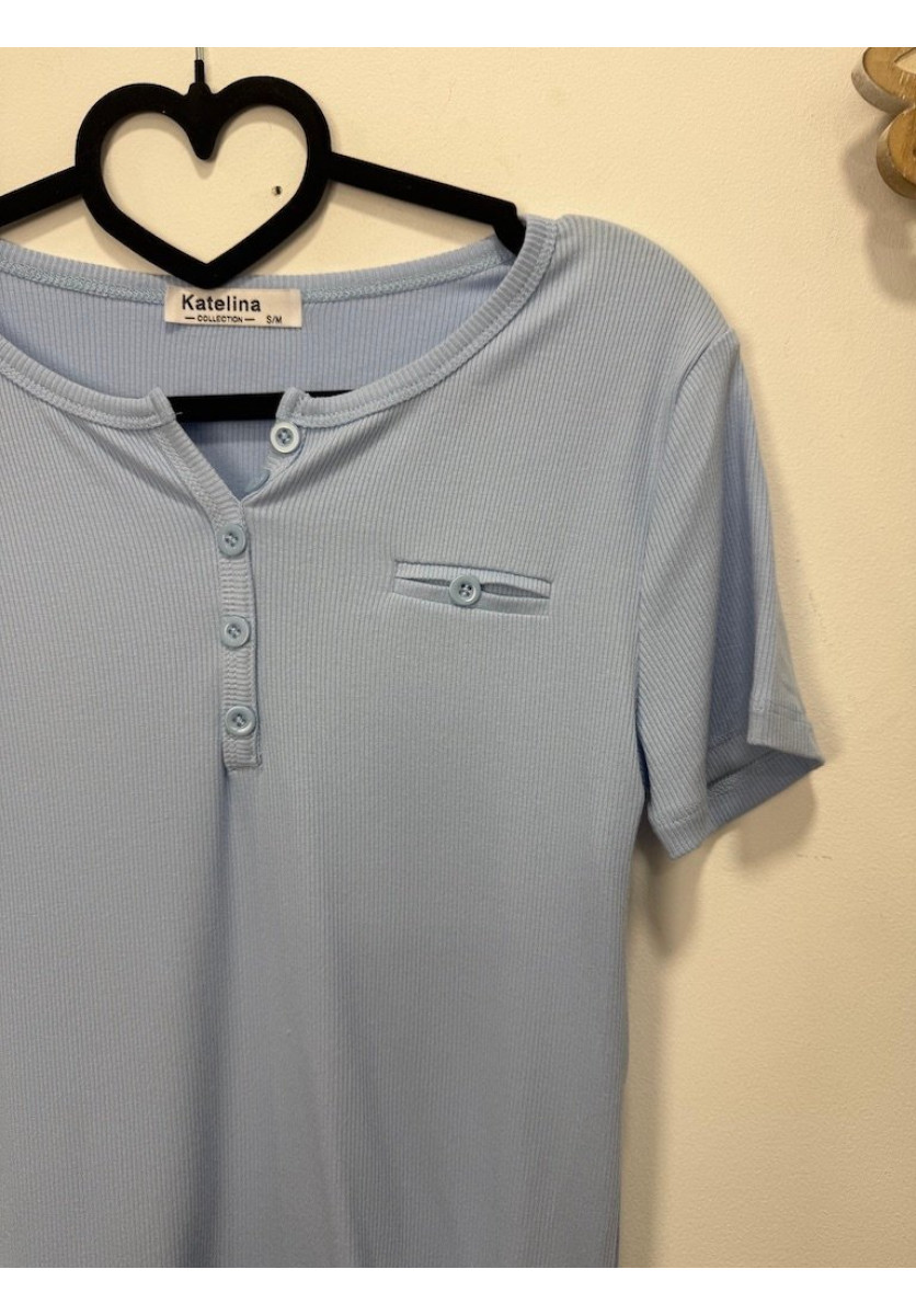 CAMISETA CANALÉ EN TONO AZUL CON MANGA CORTA Y ESCOTE REDONDO CON BOTONES FRONTALES QUE APORTAN UN TOQUE CASUAL Y ACTUAL TEJIDO ELÁSTICO Y CÓMODO QUE SE ADAPTA A LA SILUETA PERFECTA PARA CREAR LOOKS BÁSICOS CON ESTILO Y PERSONALIDAD.