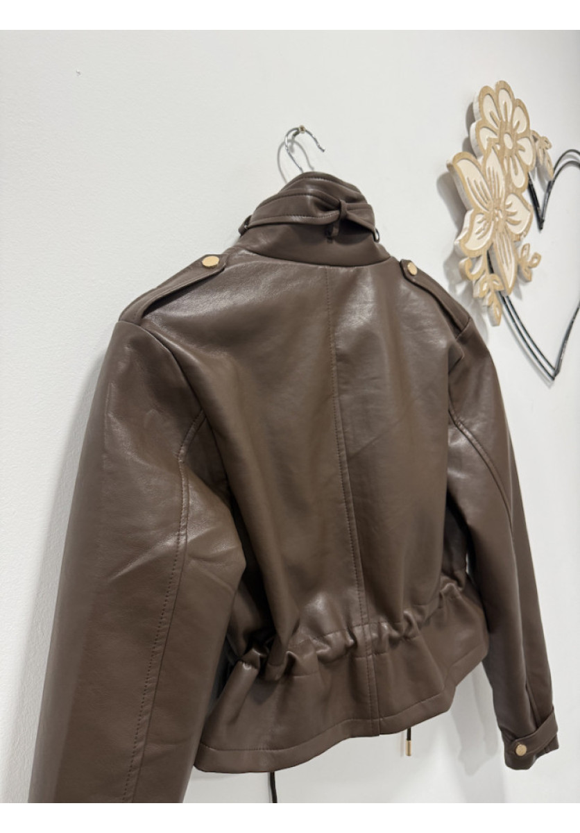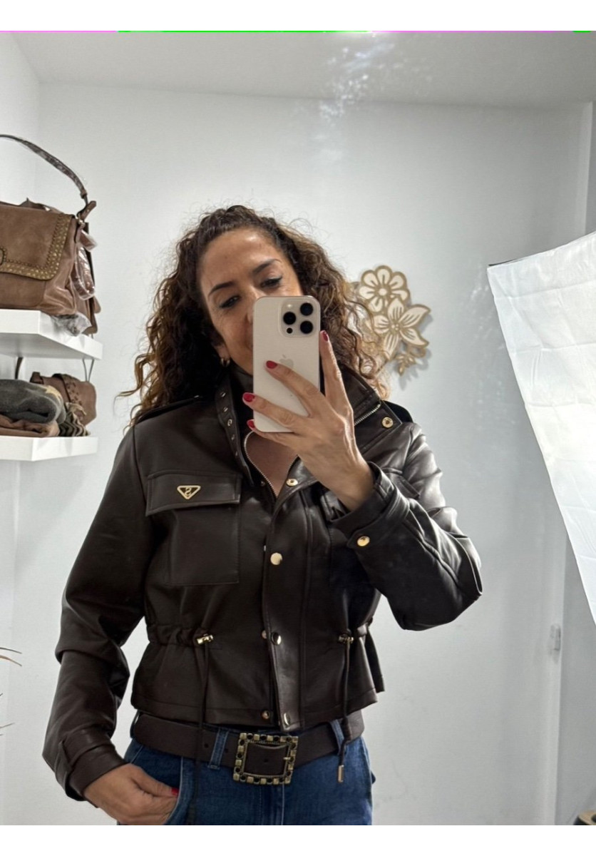 CHAQUETA CORTA POLIPIEL CON CORTE ELEGANTE, CON CUELLO ALTO  AJUSTABLE MEDIANTE CORREA Y HEBILLA METALICA. PRESENTA BOLSILLO CON SOLAPAS ADORNADAS CON UN DELICADO ESCUDO DORADO, QUE APORTA UN TOQUE DE DISTINCION Y ESTILO CONTEMPORANEO. UNA PIEZA VERSATIL QUE COMBINA SOFISTICACION Y CARACTER EN CADA DETALLE.