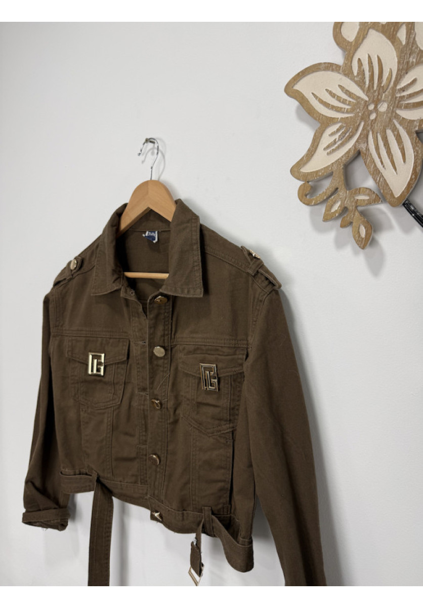 CHAQUETA VAQUERA DE CORTE CORTO, DISEÑADA PARA APORTAR UN ESTILO SOFISTICADO Y ACTUAL. INCORPORA PLACAS DECORATIVAS DORADAS EN LOS BOLSILLOS FRONTALES, BOTONES METALICOS A JUEGO Y CHARRETERAS EN LOS HOMBROS QUE REALZAN SU CARACTER URBANO Y ELEGANTE.