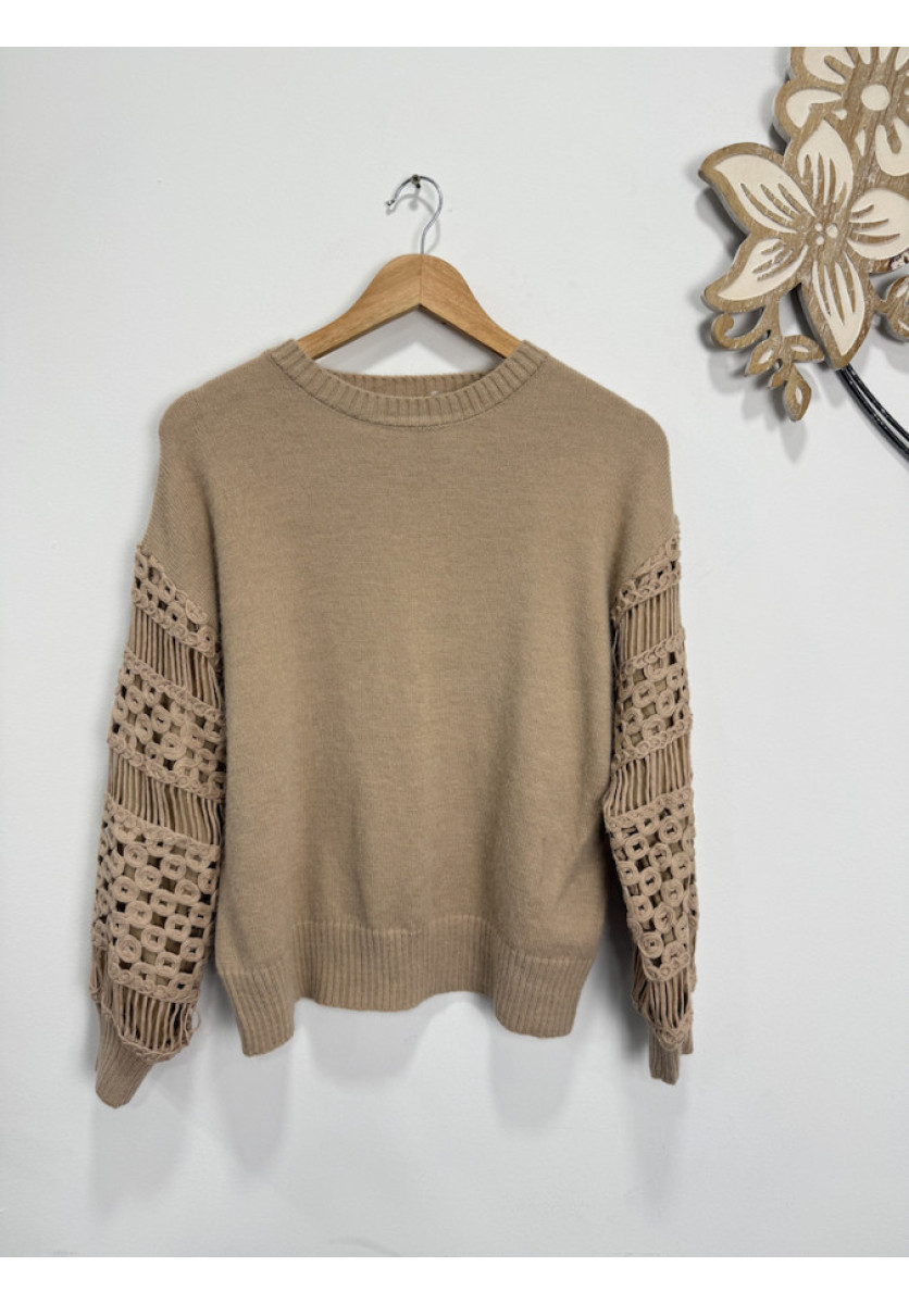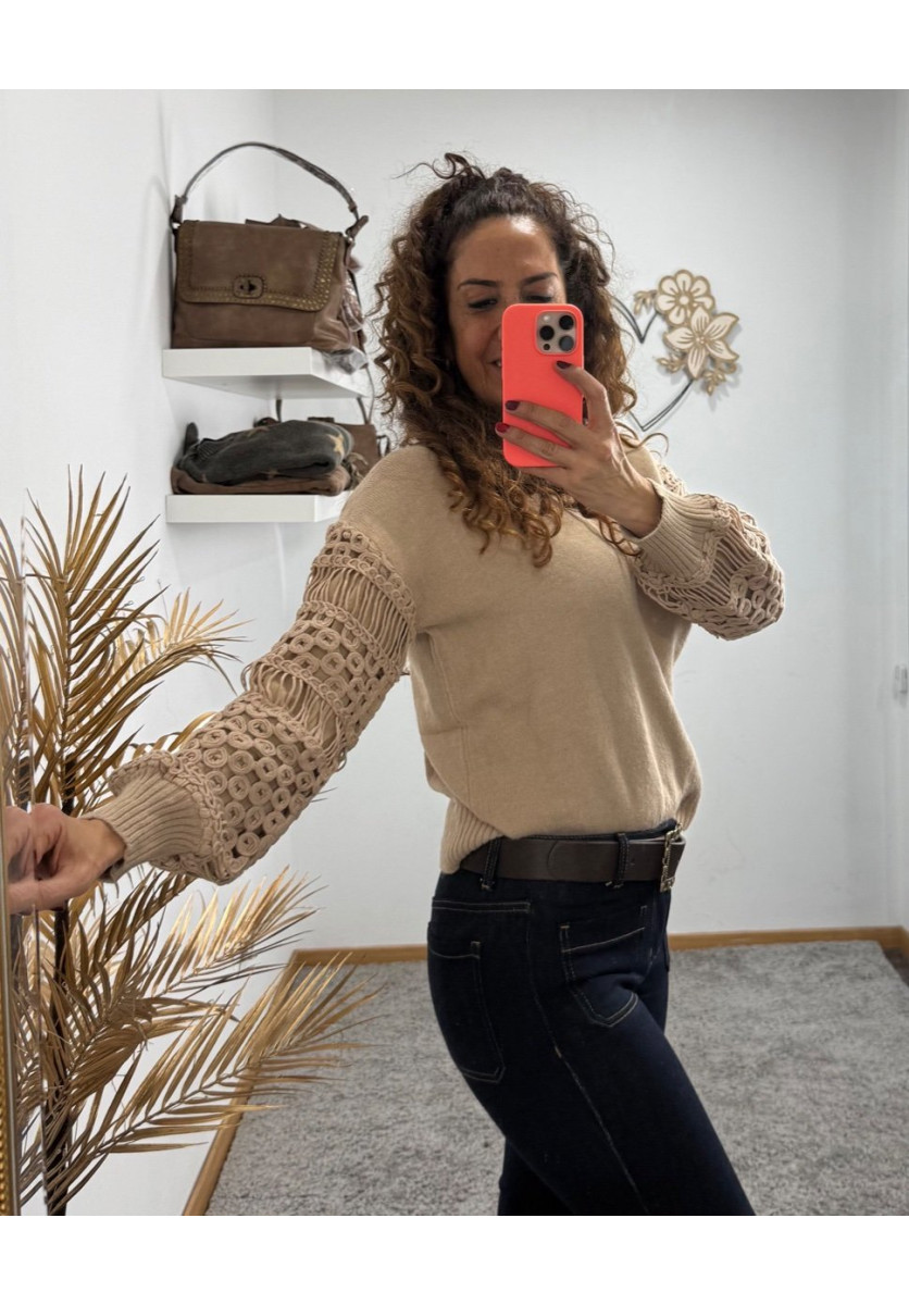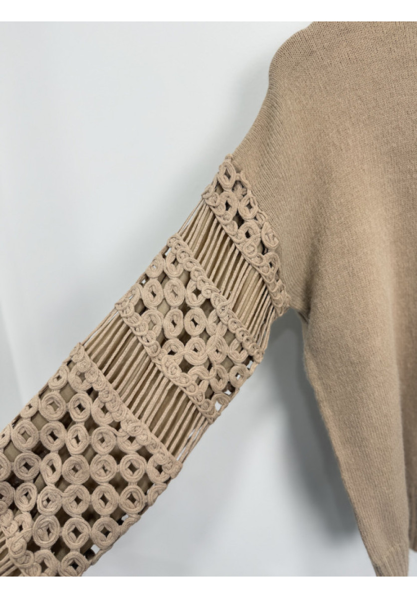 JERSEY DE PUNTO EN TONO CAMEL CÁLIDO, CON CUELLO REDONDO CLÁSICO Y CORTE RECTO. EL DISEÑO DESTACA POR SUS MANGAS LARGAS ELABORADAS CON UN DELICADO TRABAJO CALADO Y DETALLES GEOMÉTRICOS,LOS PUÑOS Y EL BAJO SON DE PUNTO ACANALADO,