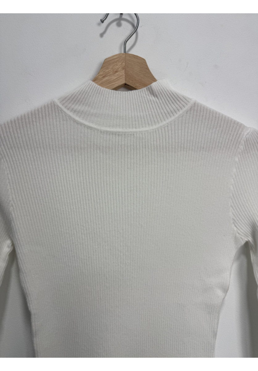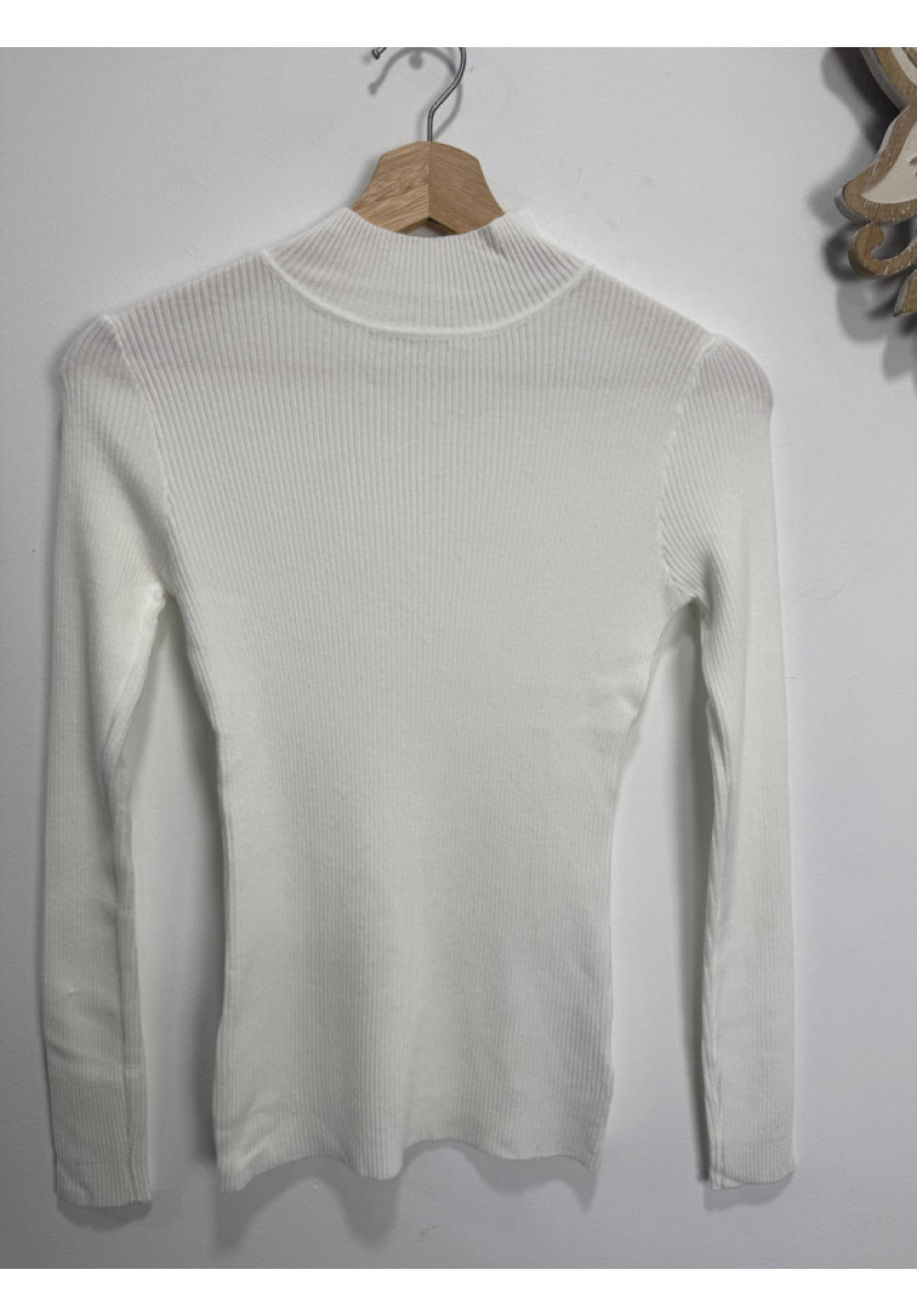 JERSEY DE PUNTO ACANALADO EN COLOR BLANCO DE MANGA LARGA Y CORTE ENTALLADO, TIENE UN CUELLO ALTO TIPO MOCK QUE LE DA UN AIRE ELEGANTE. EL TEJIDO ES ELÁSTICO Y FINO.