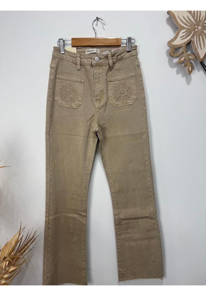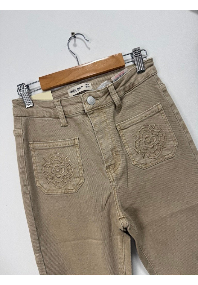 PANTALÓN BEIGE DE CORTE RECTO Y TIRO MEDIO CON DISEÑO CLÁSICO Y FAVORECEDOR DETALLE DE BORDADO FLORAL EN LOS BOLSILLOS QUE APORTA UN TOQUE DELICADO Y DIFERENTE TEJIDO CÓMODO Y VERSÁTIL PERFECTO PARA CREAR LOOKS NATURALES Y ELEGANTES PARA EL DÍA A DÍA