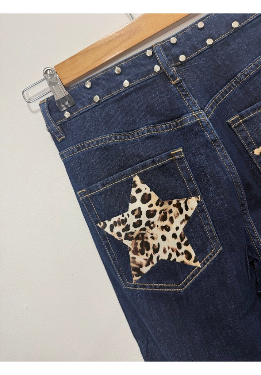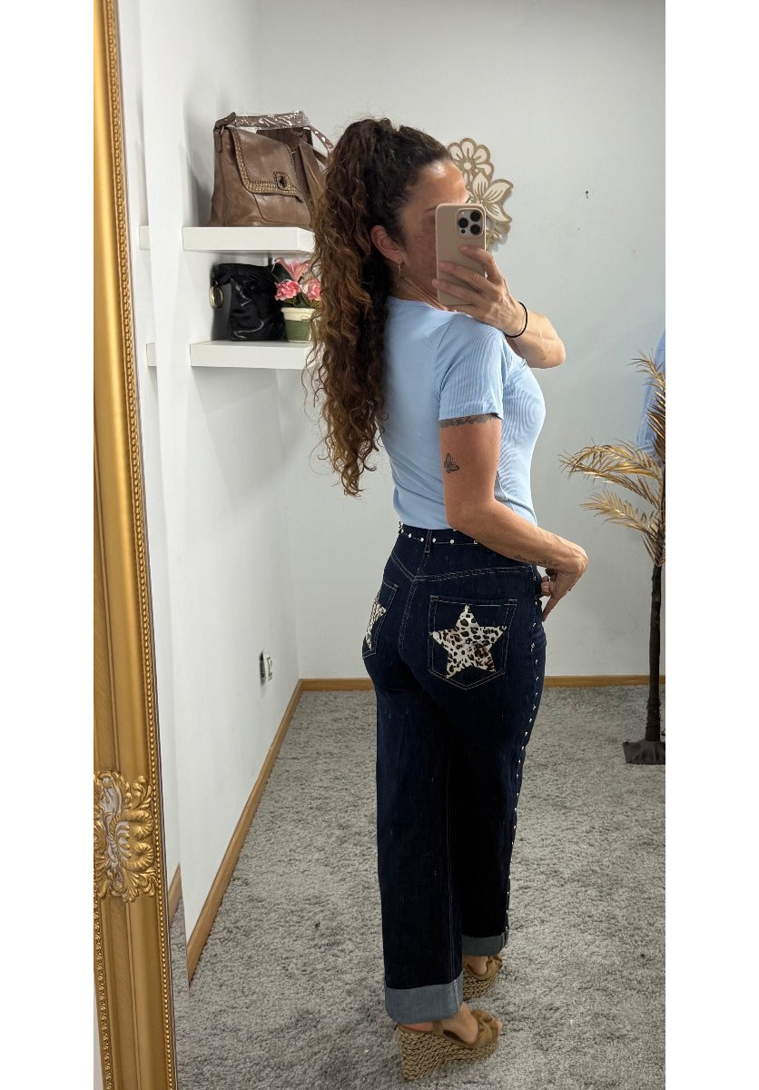 PANTALÓN VAQUERO OSCURO DE TIRO ALTO CON CORTE WIDE LEG Y BAJO DOBLADO QUE APORTA UN ESTILO ACTUAL Y DESENFADADO DETALLE DE TACHUELAS LATERALES QUE ESTILIZAN LA PIERNA Y BOLSILLOS TRASEROS CON ESTRELLA EN ESTAMPADO ANIMAL PRINT QUE LE DAN UN TOQUE ORIGINAL Y CAÑERO TEJIDO DENIM CON CUERPO PERFECTO PARA CREAR LOOKS URBANOS CON PERSONALIDAD.