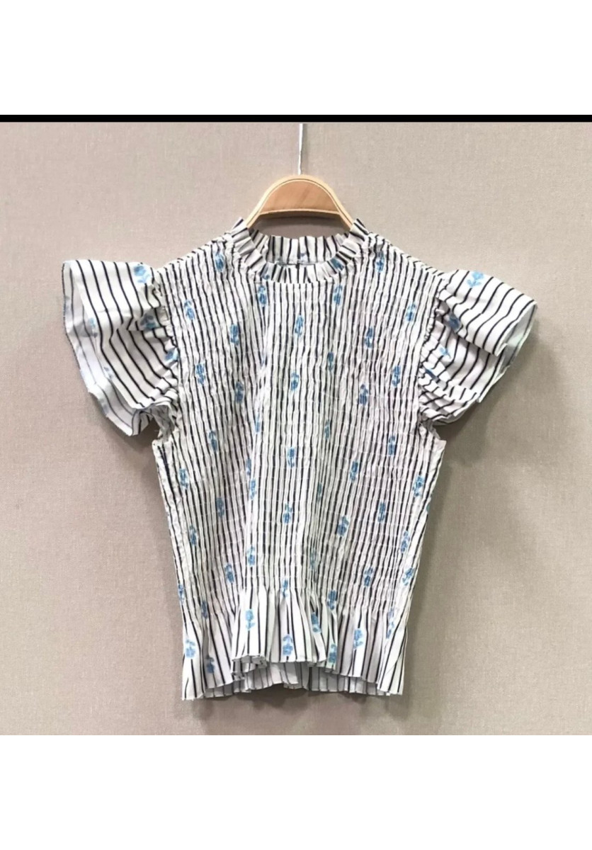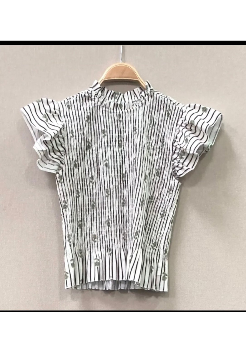 \nEL ESTAMPADO DE RAYAS FINAS SE MEZCLA CON DELICADOS DETALLES FLORALES EN TONOS SUAVES, APORTANDO UN AIRE FEMENINO Y DIFERENTE. SUS MANGAS CORTAS CON VOLANTE AÑADEN MOVIMIENTO Y UN TOQUE ESPECIAL QUE ELEVA CUALQUIER LOOK.